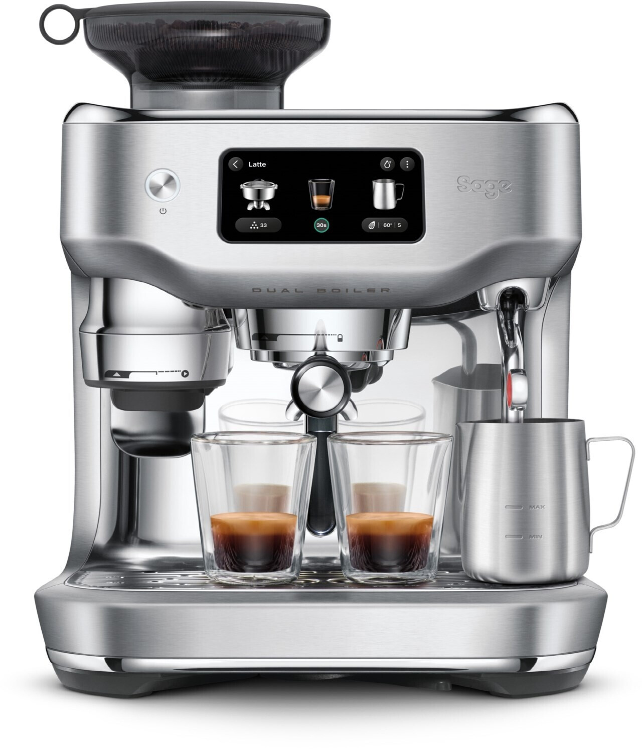 Sage The Oracle Dual Boiler دستگاهی حرفهای با بویلر دوگانه برای کنترل دقیق دما و استخراج قهوه با کیفیت کافهای است. مجهز به آسیاب داخلی و سیستم اتوماتیک تنظیم فشار بخار و دمآوری.